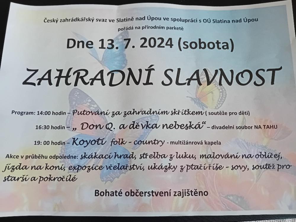 Český zahrádkářský svaz ve Slatině nad Úpou s přispěním Obce Slatina nad Úpou uspořádal v sobotu 13. 7. 2024 na přírodním parketu "ZAHRADNÍ SLAVNOST".