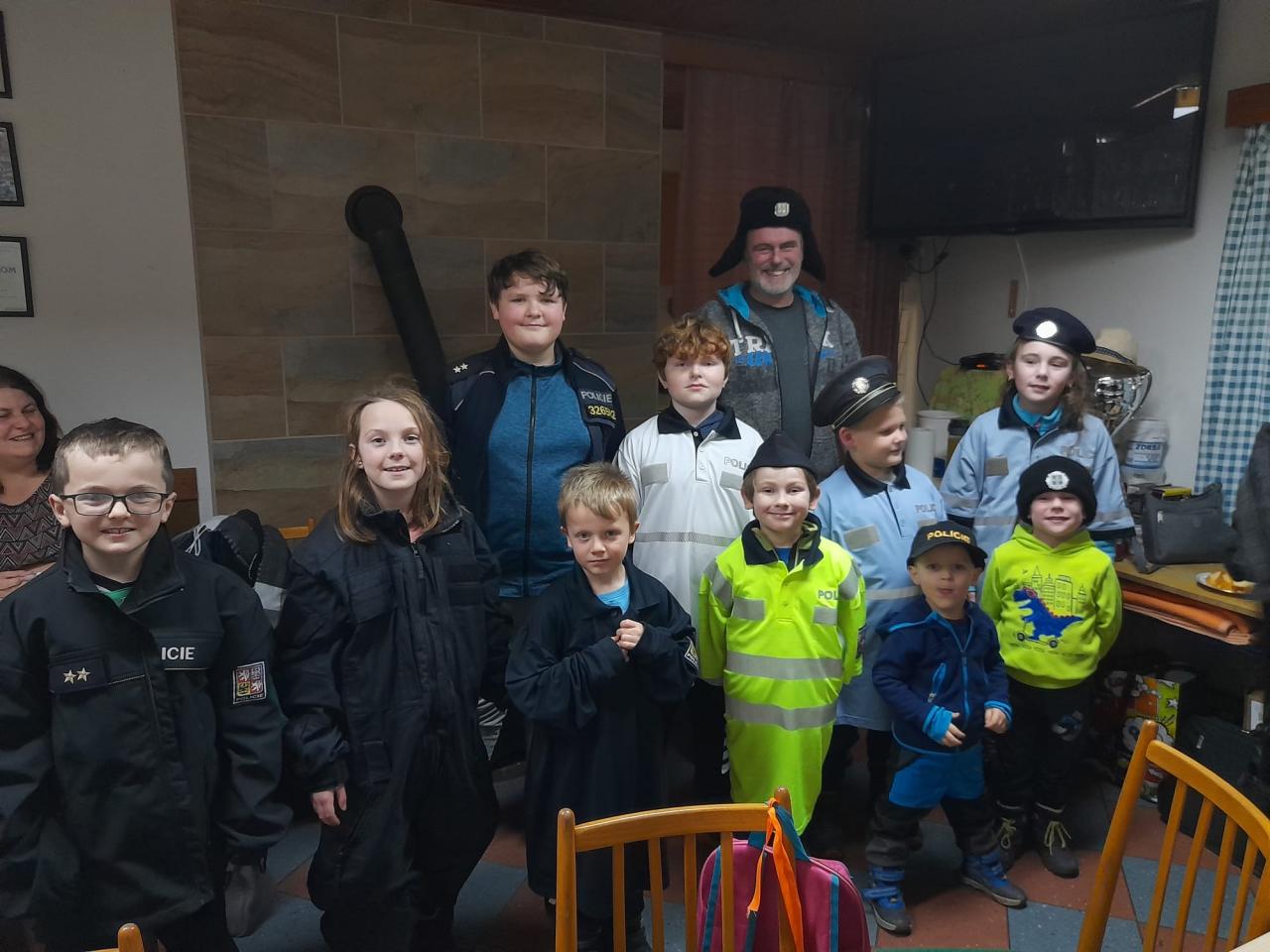 Děti měly možnost při velmi poutavém a poučném povídání pana Mervarta na vlastní oči vidět a vyzkoušet si výstroj, která v základní výbavě váží neuvěřitelných 20 kg. Děti si mohly vyzkoušet z pokrývek hlavy čepici - tzv. satelit, kulich, ušanku, baret, kšiltovku, lodičku. Dále pan Mervart předvedl dětem uniformu - vzor 92 na zásahy, reflexní tričko - dopravní inspektorát, bílé tričko - příslušníci dálniční Policie a taktickou vestu s doplňky. A nejvíce děti zaujala prohlídka služebního vozu.