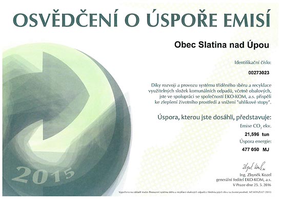 Naše Obec a její občané obdrželi osvědčení o množství vytříděného odpadu za rok 2015 a poděkování za dlouholetou spolupráci.