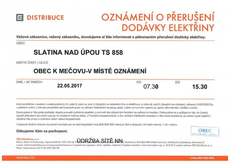 Oznamujeme přerušení dodávky elektrického proudu ve dnech 22. a 24. května 2017.