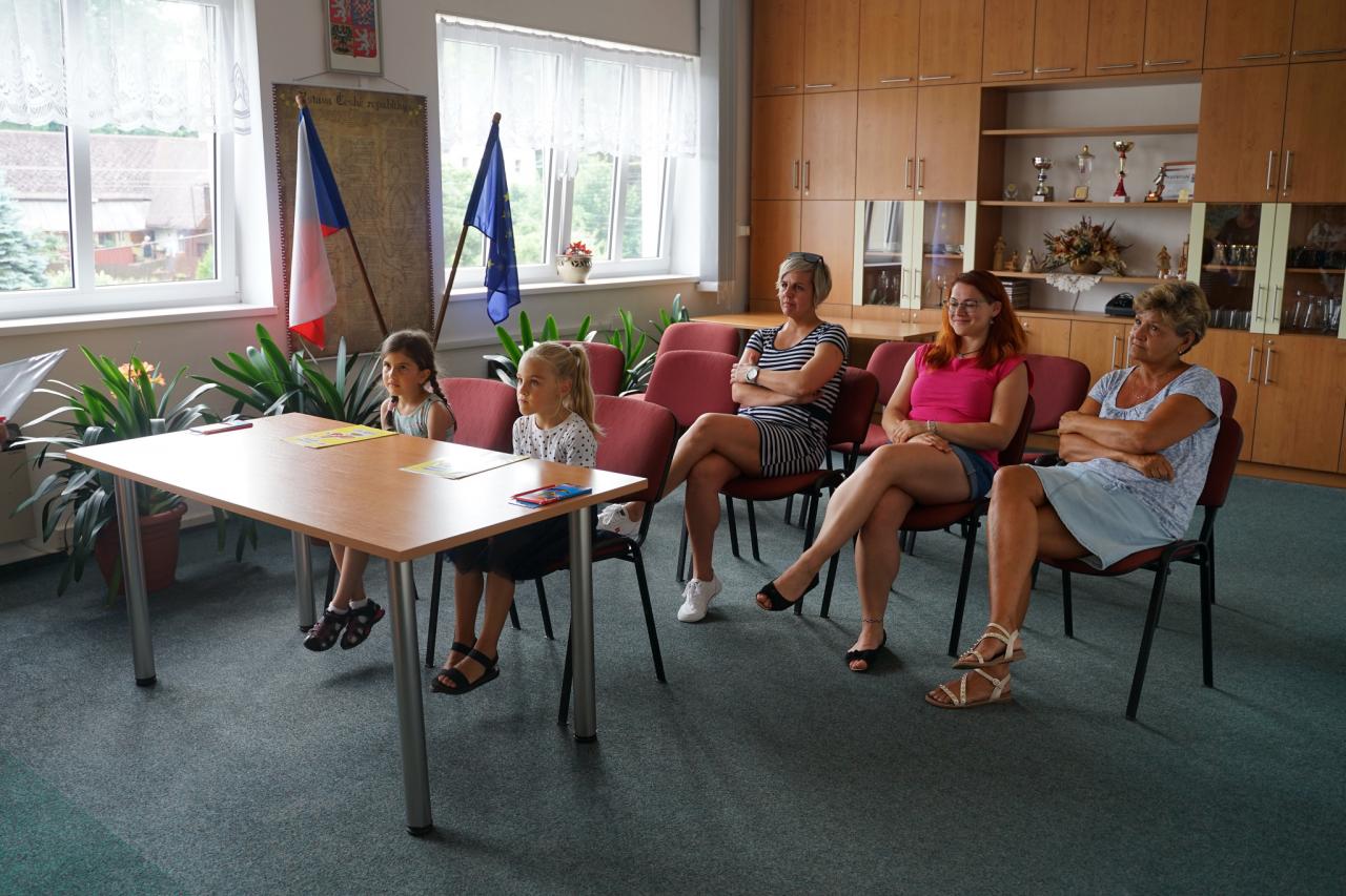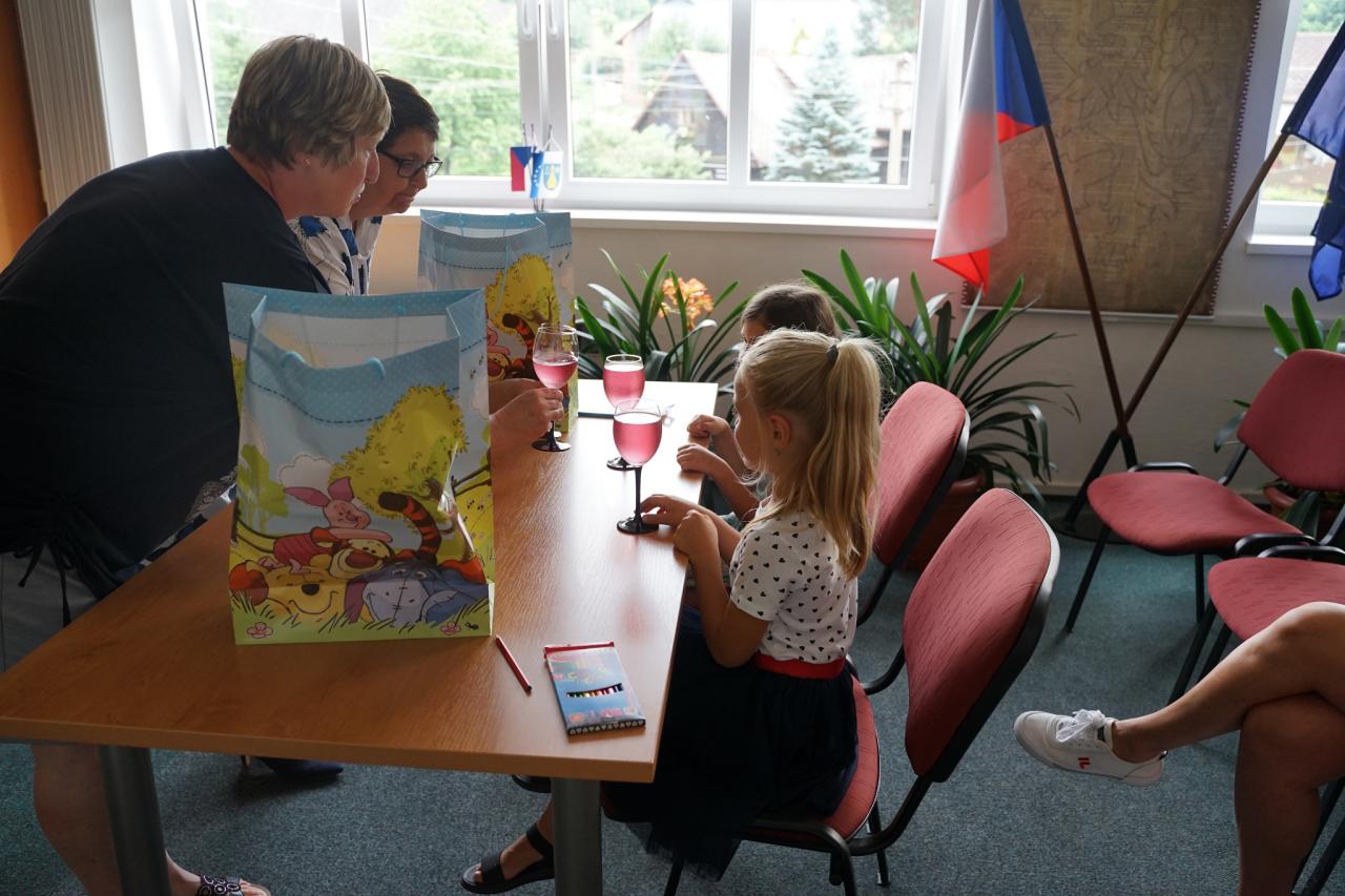 Paní starostka si připravila dva úkoly a potom byla děvčata obdarována dárky od obce pro lehčí začátek školního roku.