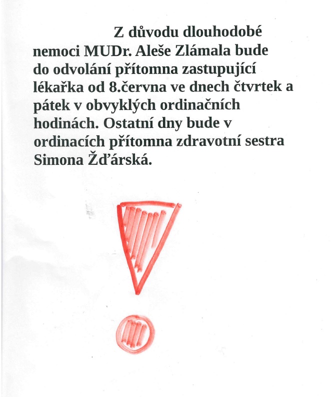 bude do odvolání přítomna zastupující lékařka od 8.června ve dnech čtvrtek a pátek v obvyklých ordinačních hodinách.